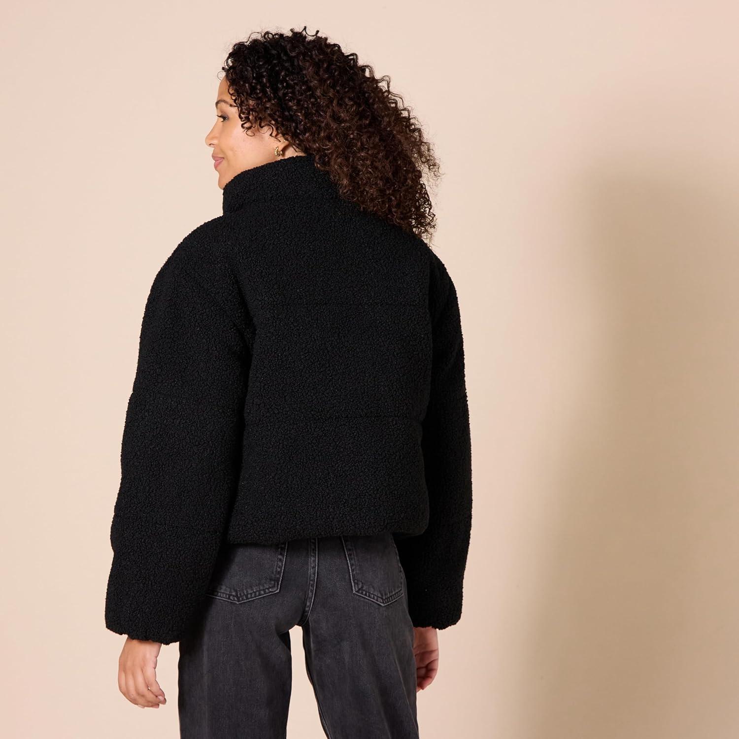 Amazon Essentials Womens Cropped Full-Zip Puffer Jacket (Quilted Matte or Sherpa Fleece)(Black Teddy Sherpa)