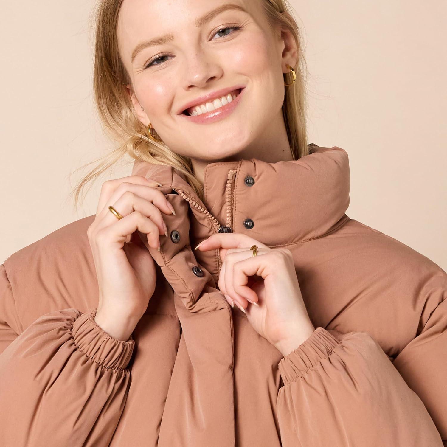 Amazon Essentials Womens Cropped Full-Zip Puffer Jacket (Quilted Matte or Sherpa Fleece)(Light Brown)
