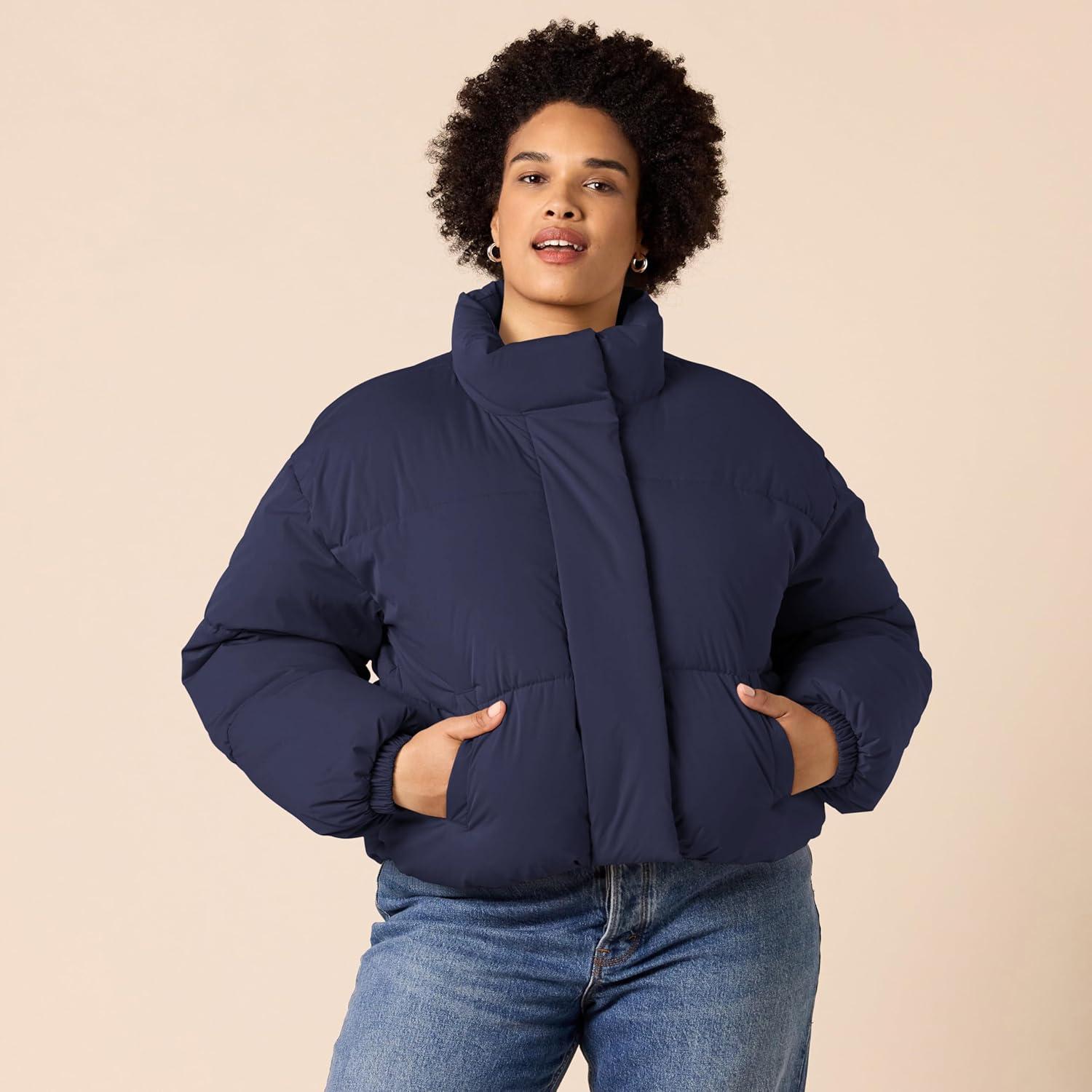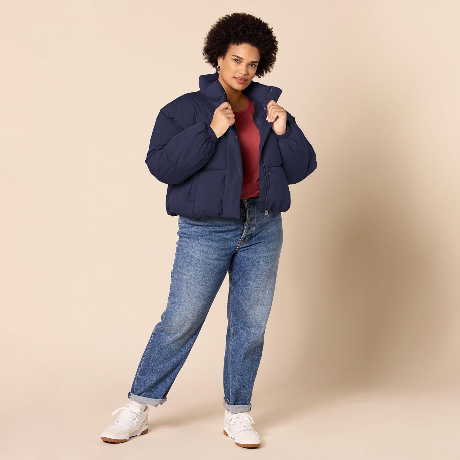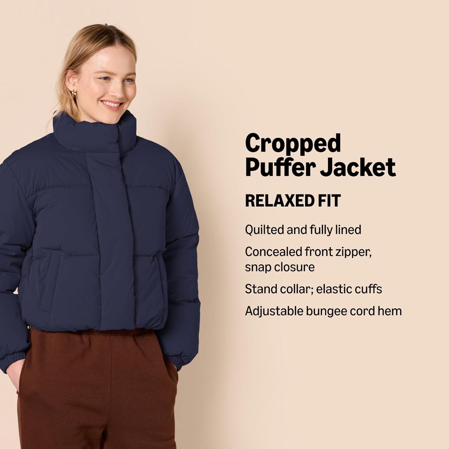 Amazon Essentials Womens Cropped Full-Zip Puffer Jacket (Quilted Matte or Sherpa Fleece)(Navy)