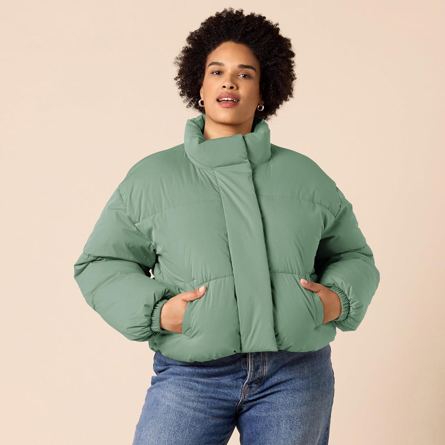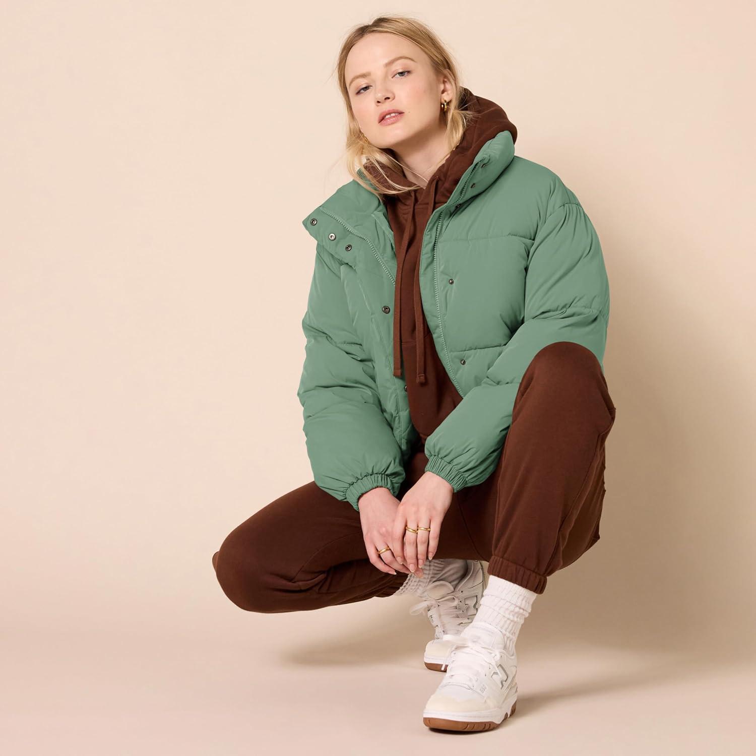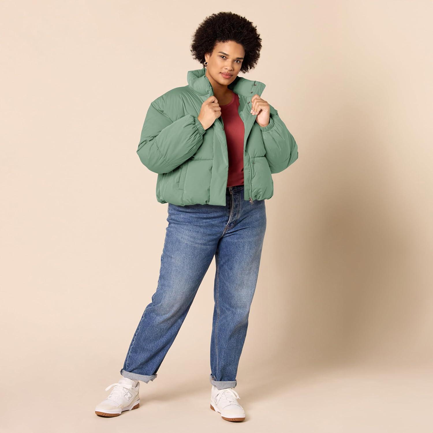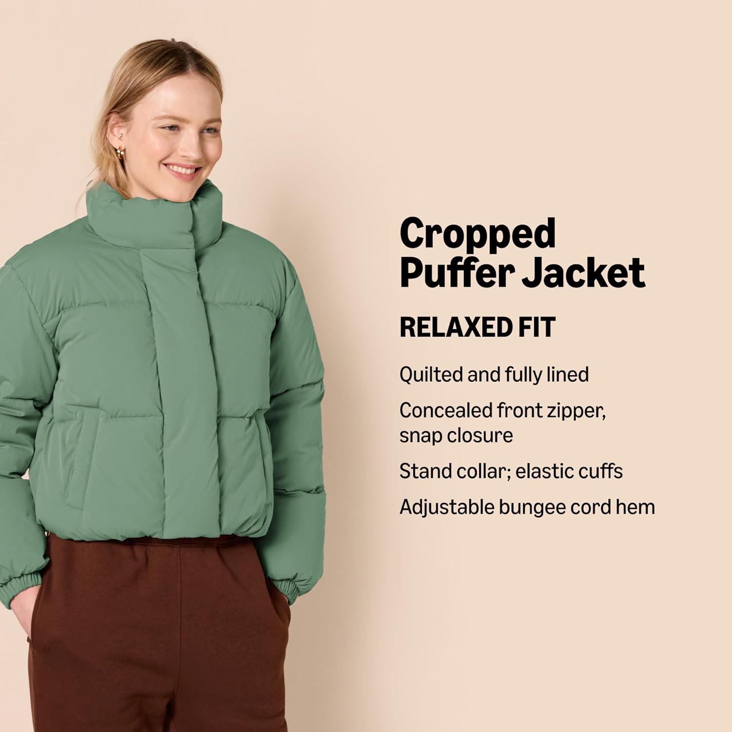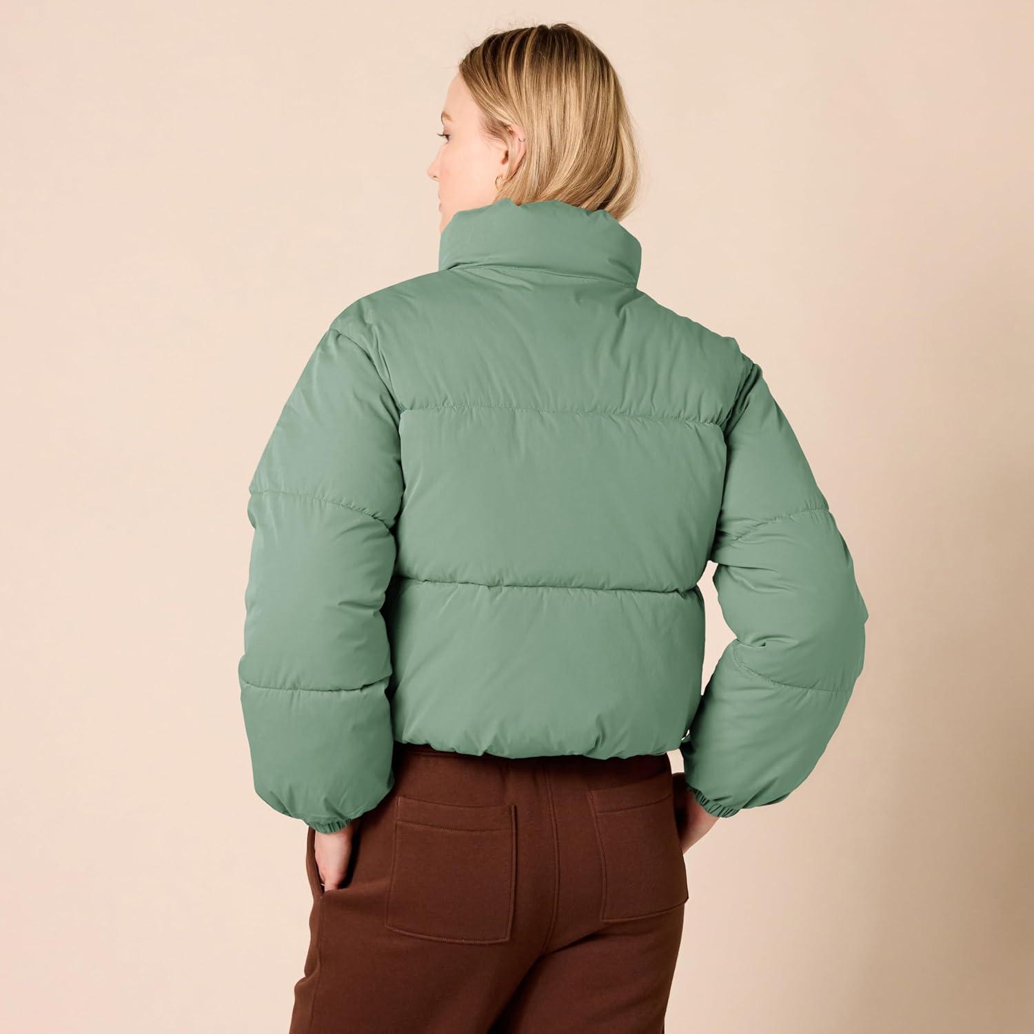 Amazon Essentials Womens Cropped Full-Zip Puffer Jacket (Quilted Matte or Sherpa Fleece)(Sage Green)