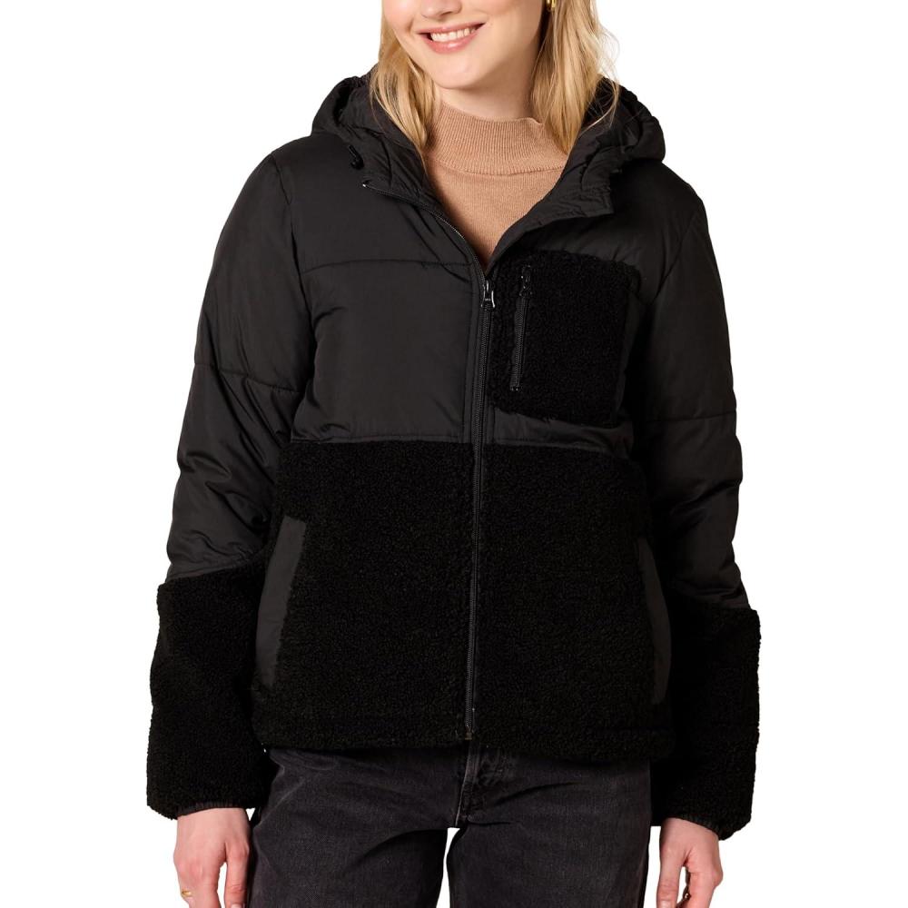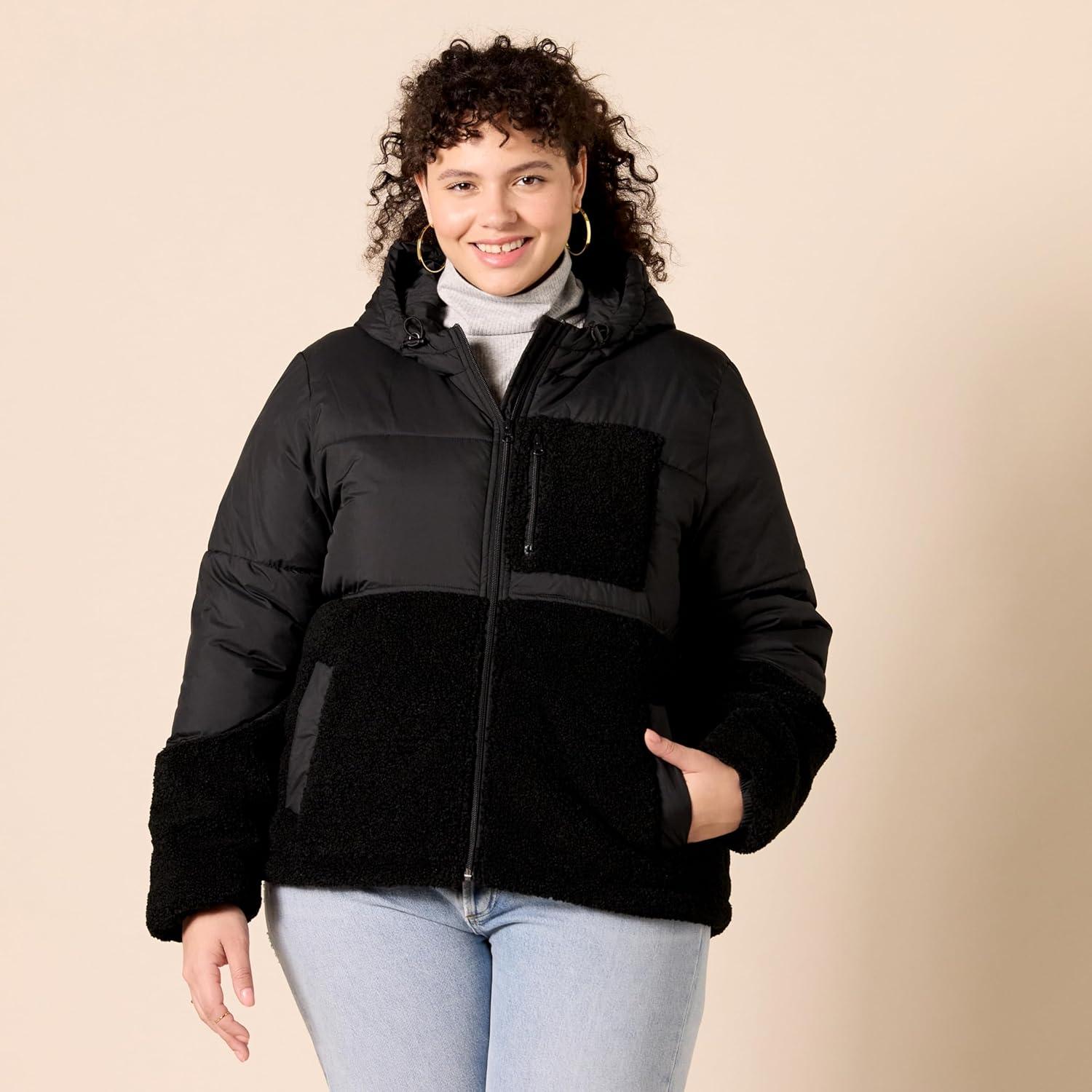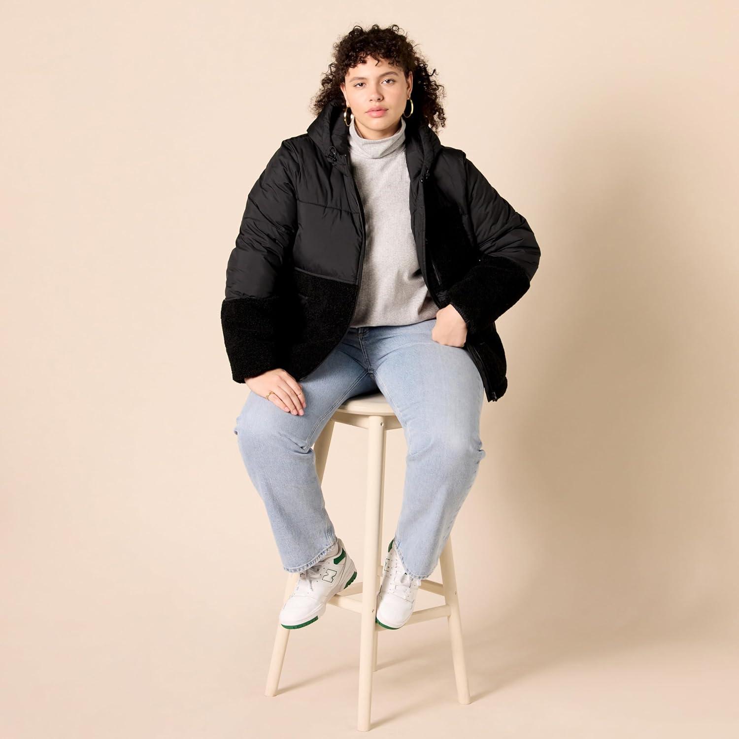 Amazon Essentials womens Full-Zip Sherpa Fleece Hooded Puffer Jacket(Black)