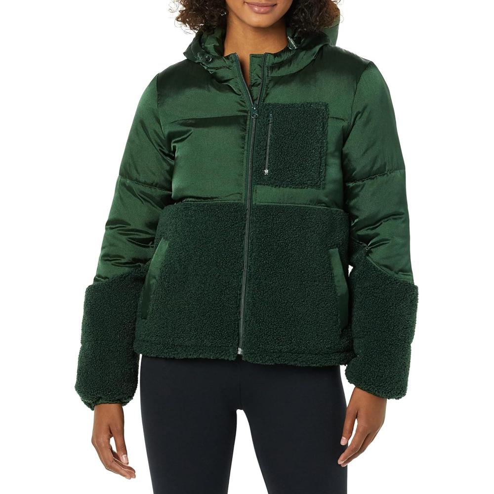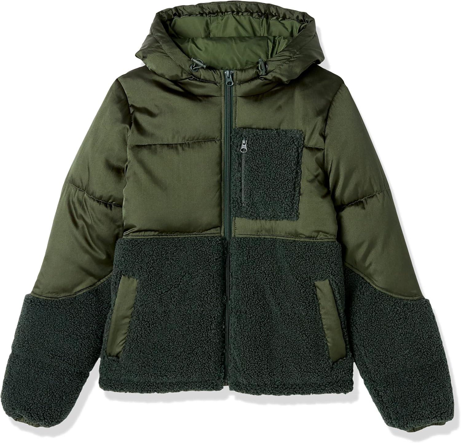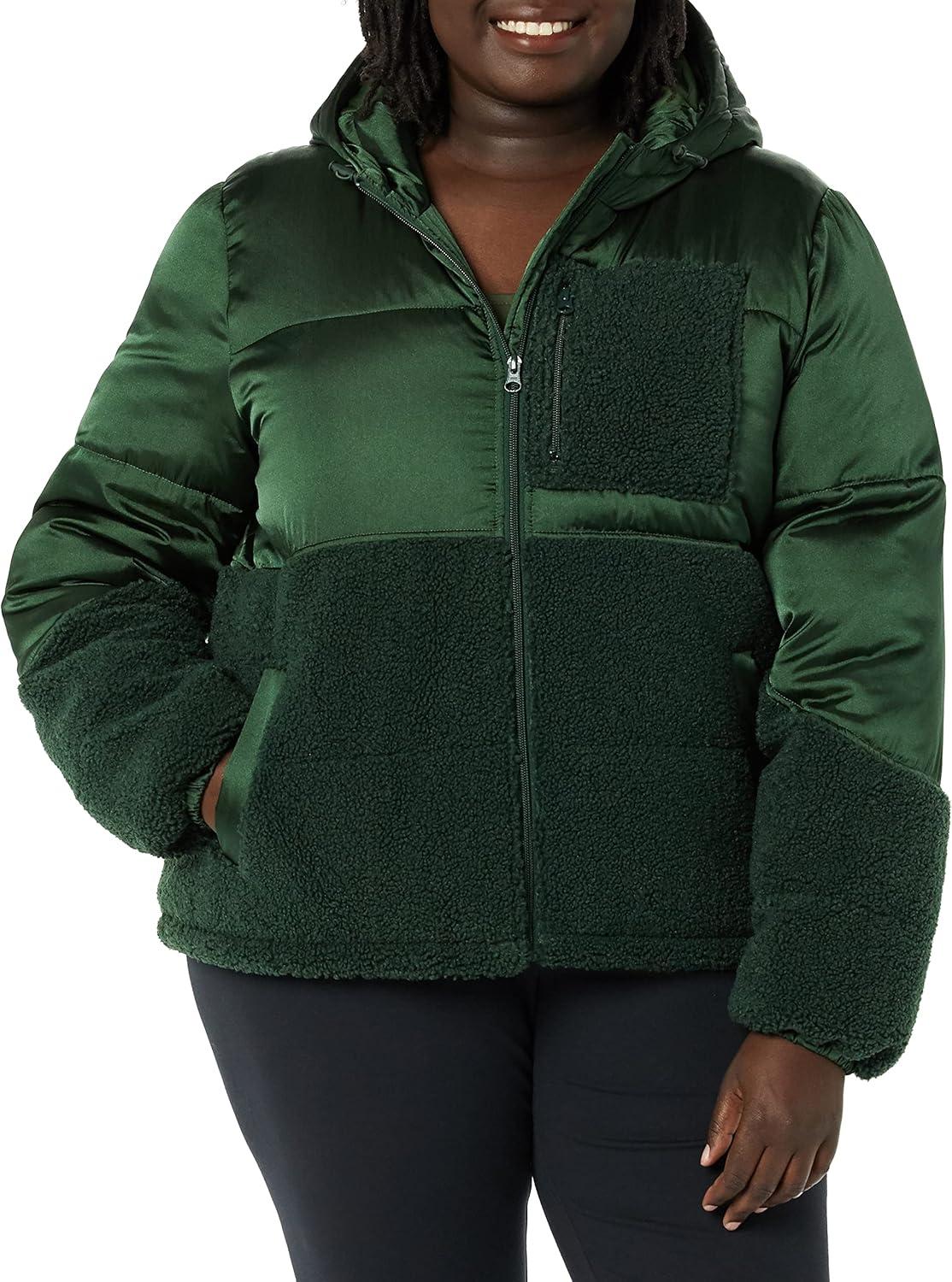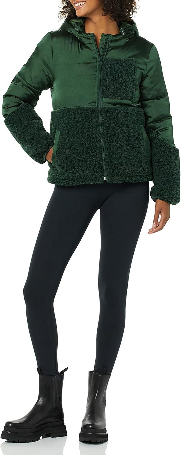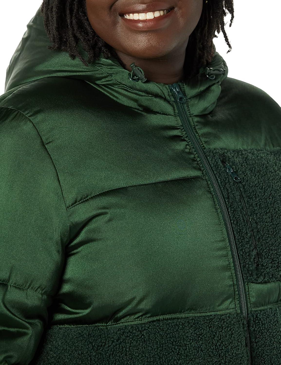 Amazon Essentials womens Full-Zip Sherpa Fleece Hooded Puffer Jacket(Dark Green Shiny)