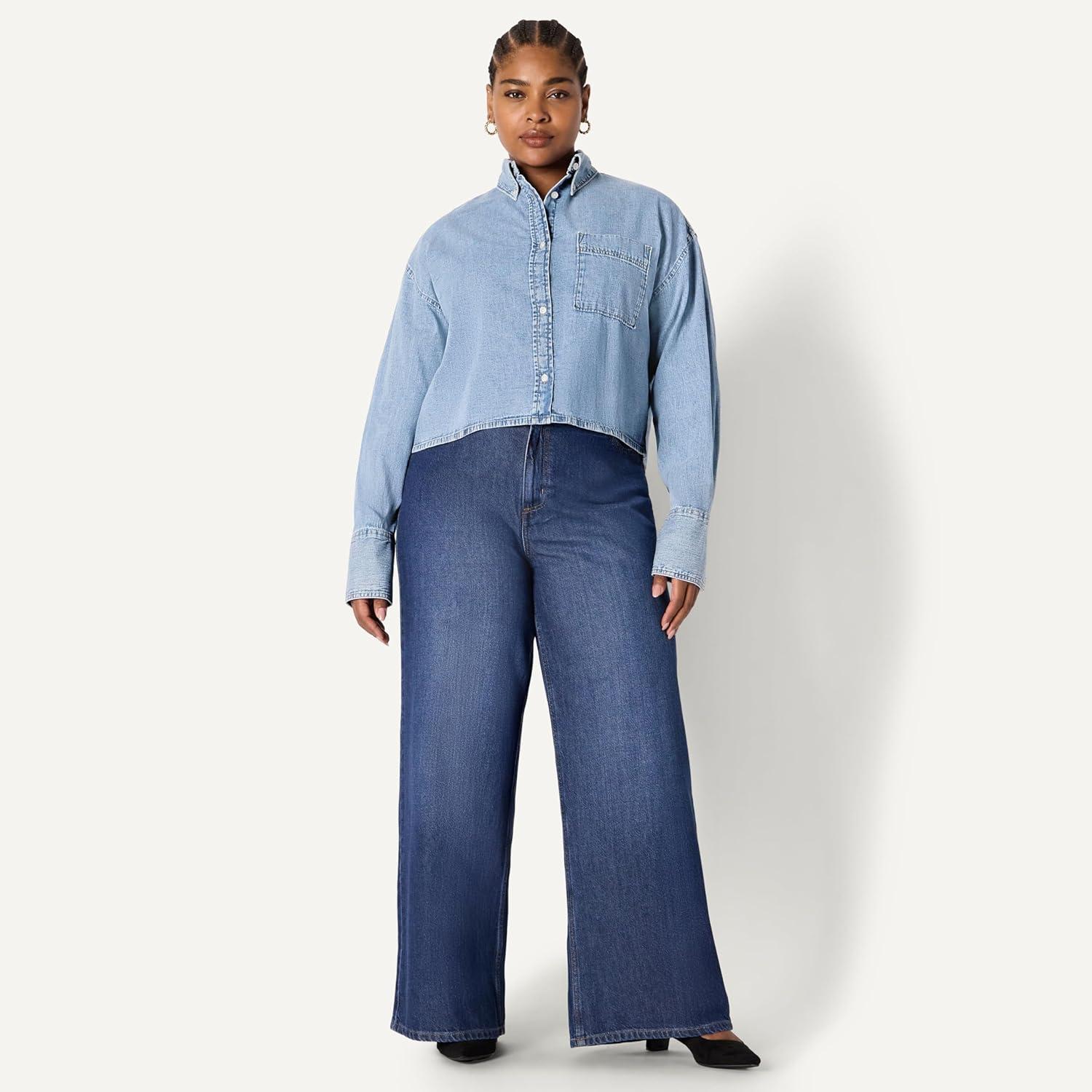 Amazon Essentials Women’s Modern Oversized-Fit Cropped Denim Button-Down Shirt(Icy Light Blue)