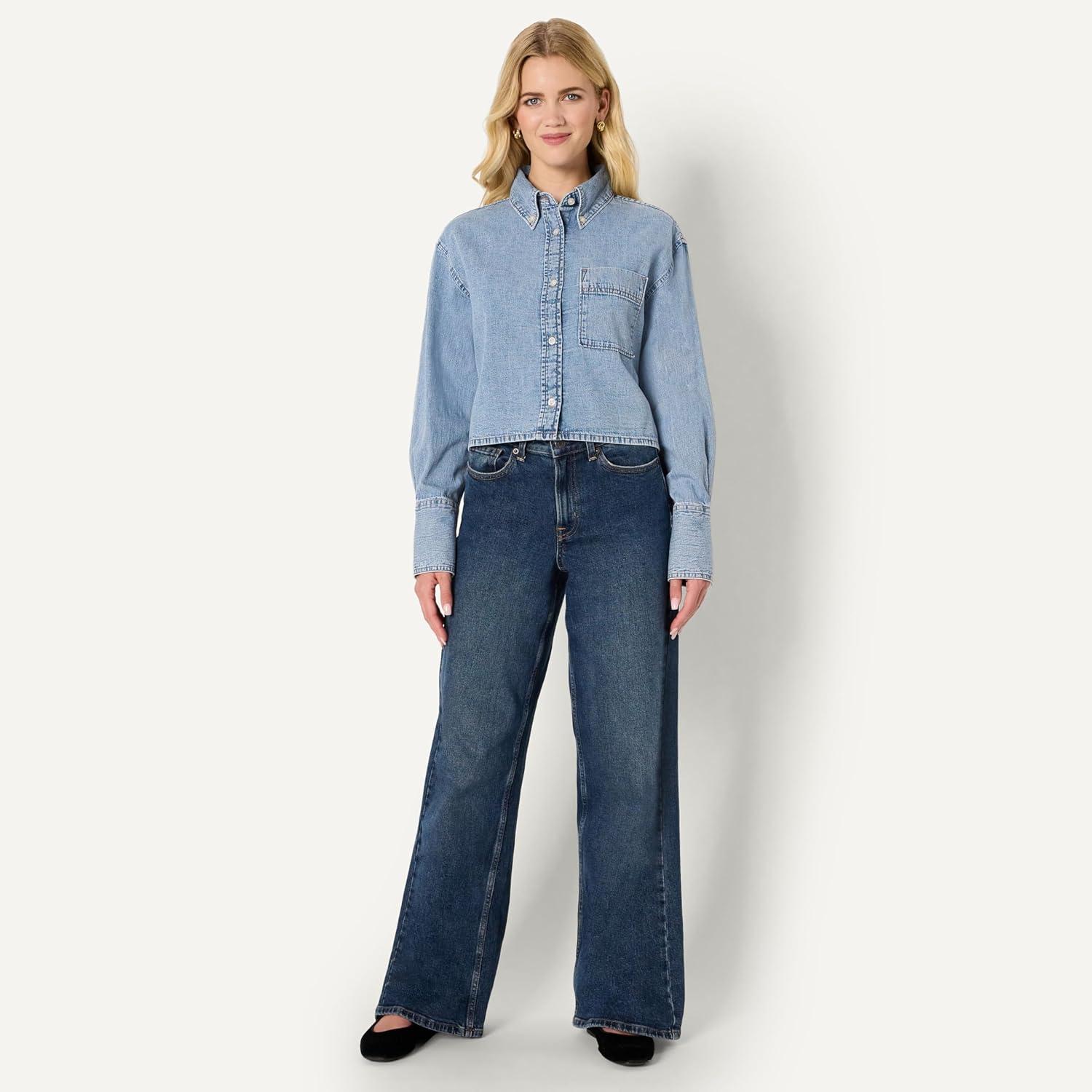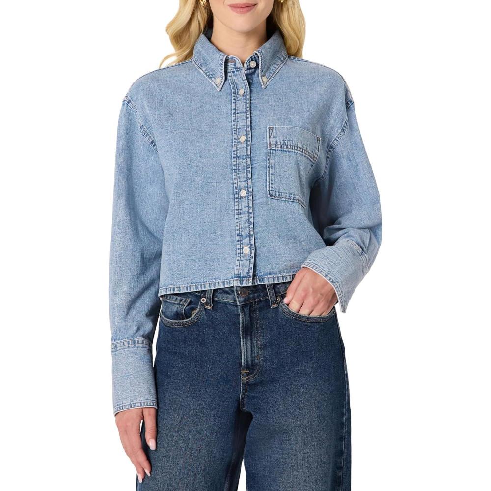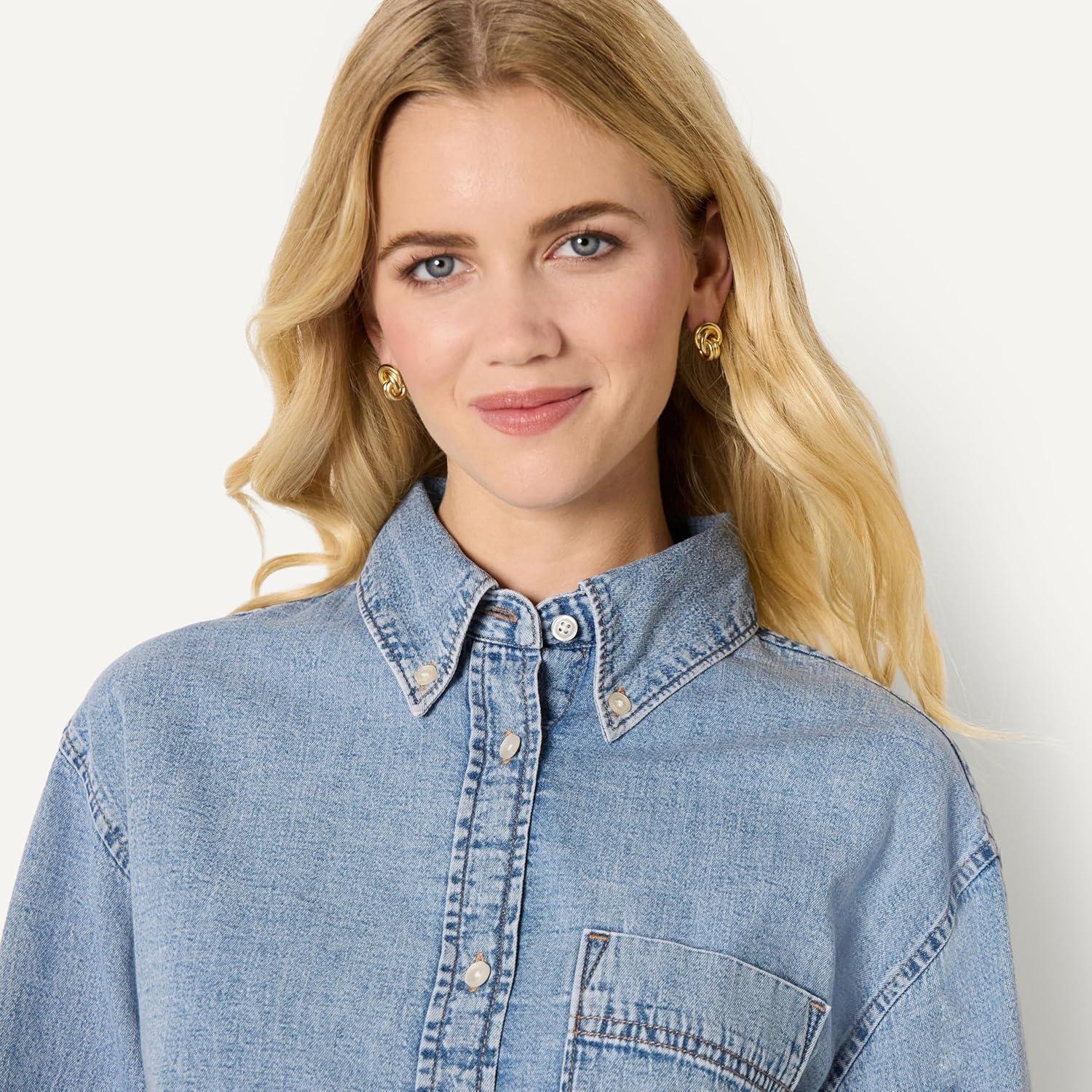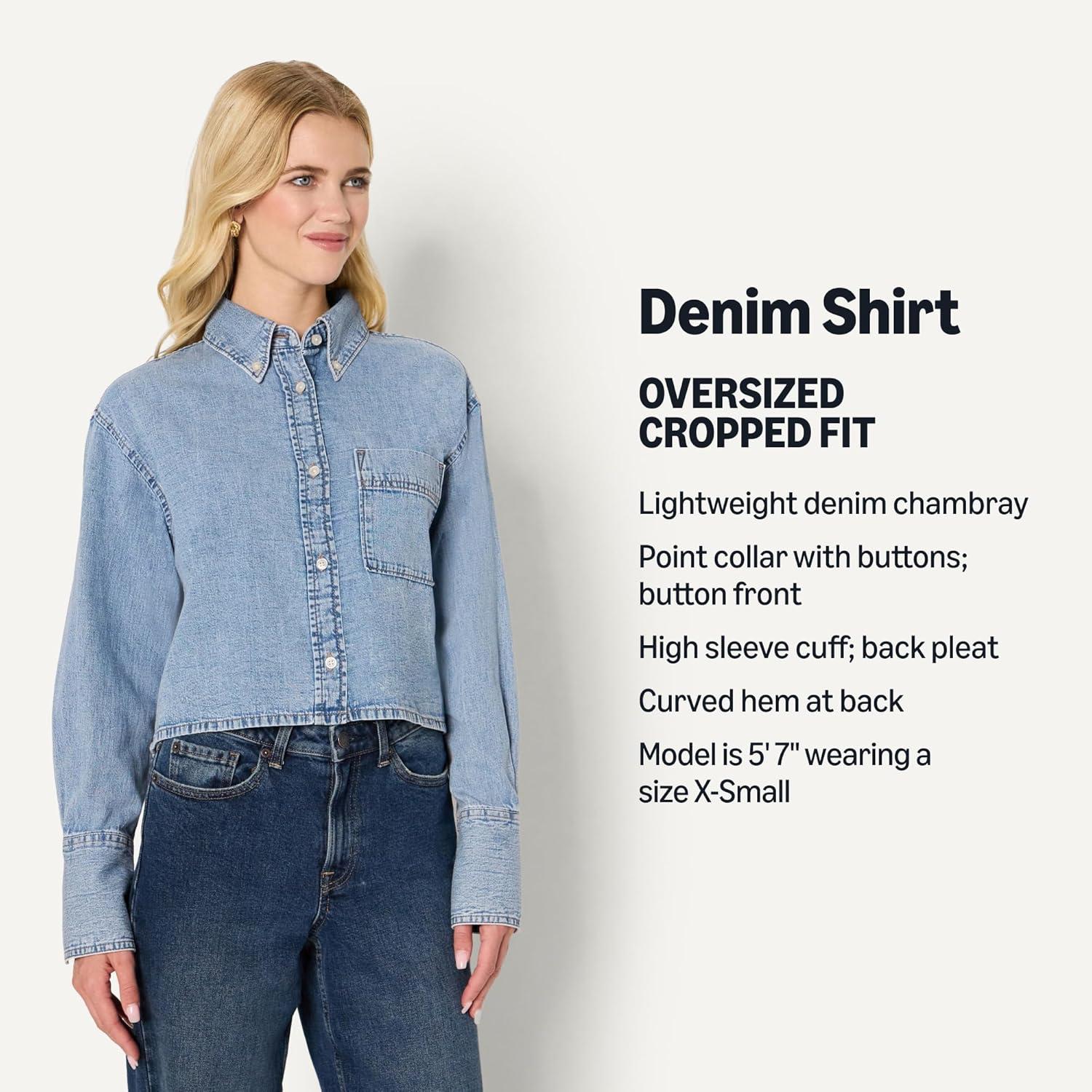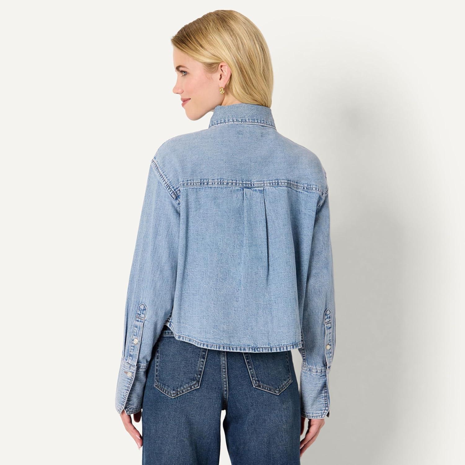 Amazon Essentials Women’s Modern Oversized-Fit Cropped Denim Button-Down Shirt(Medium Blue Vintage)