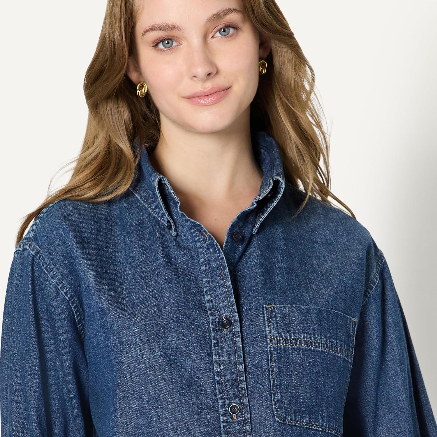 Amazon Essentials Women's Modern Oversized-Fit Cropped Denim Button-Down Shirt(Medium Blue Vintage)