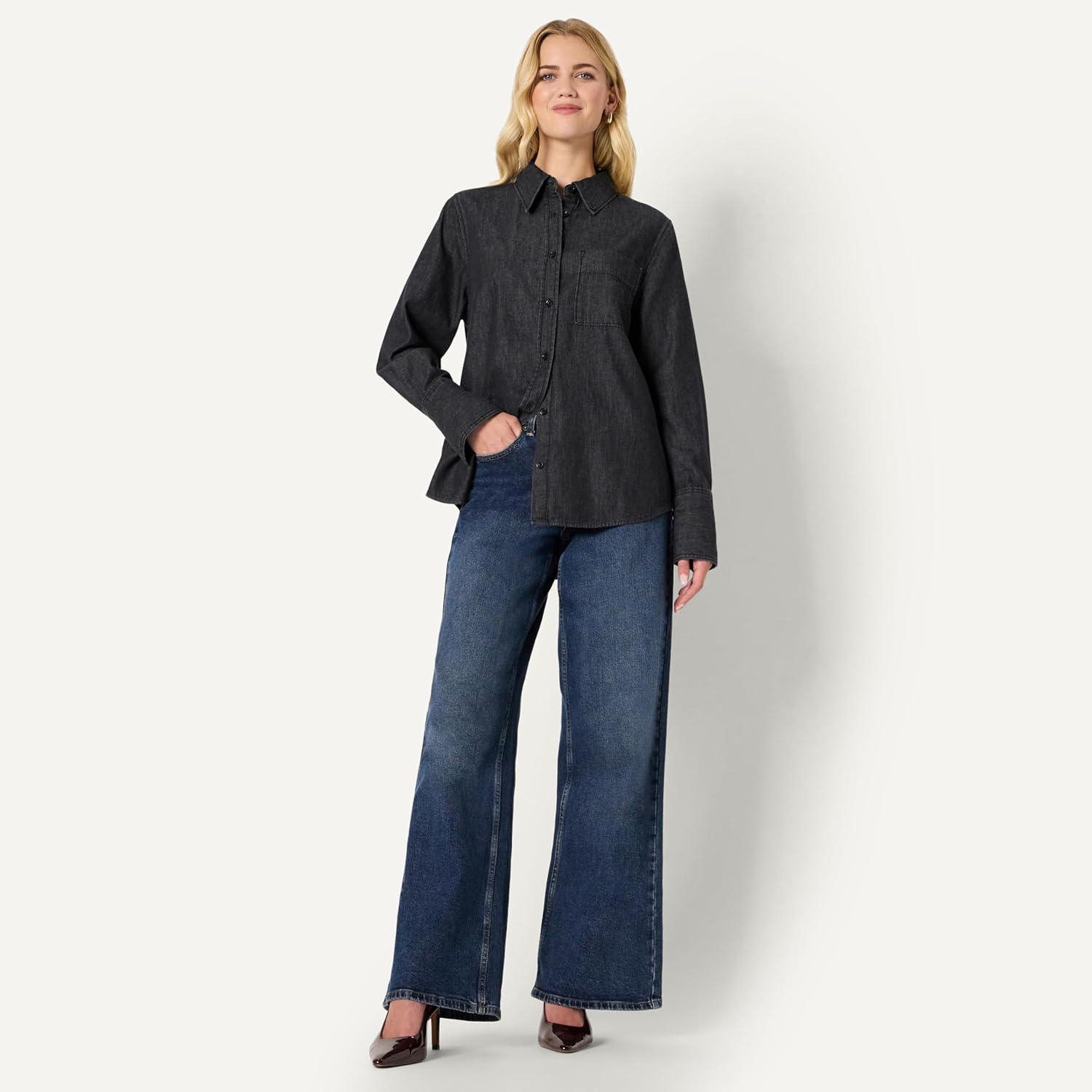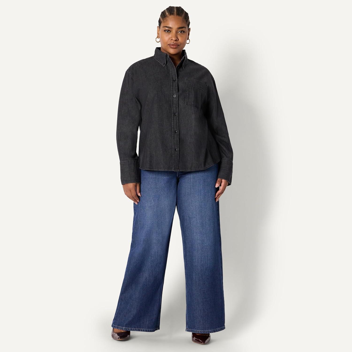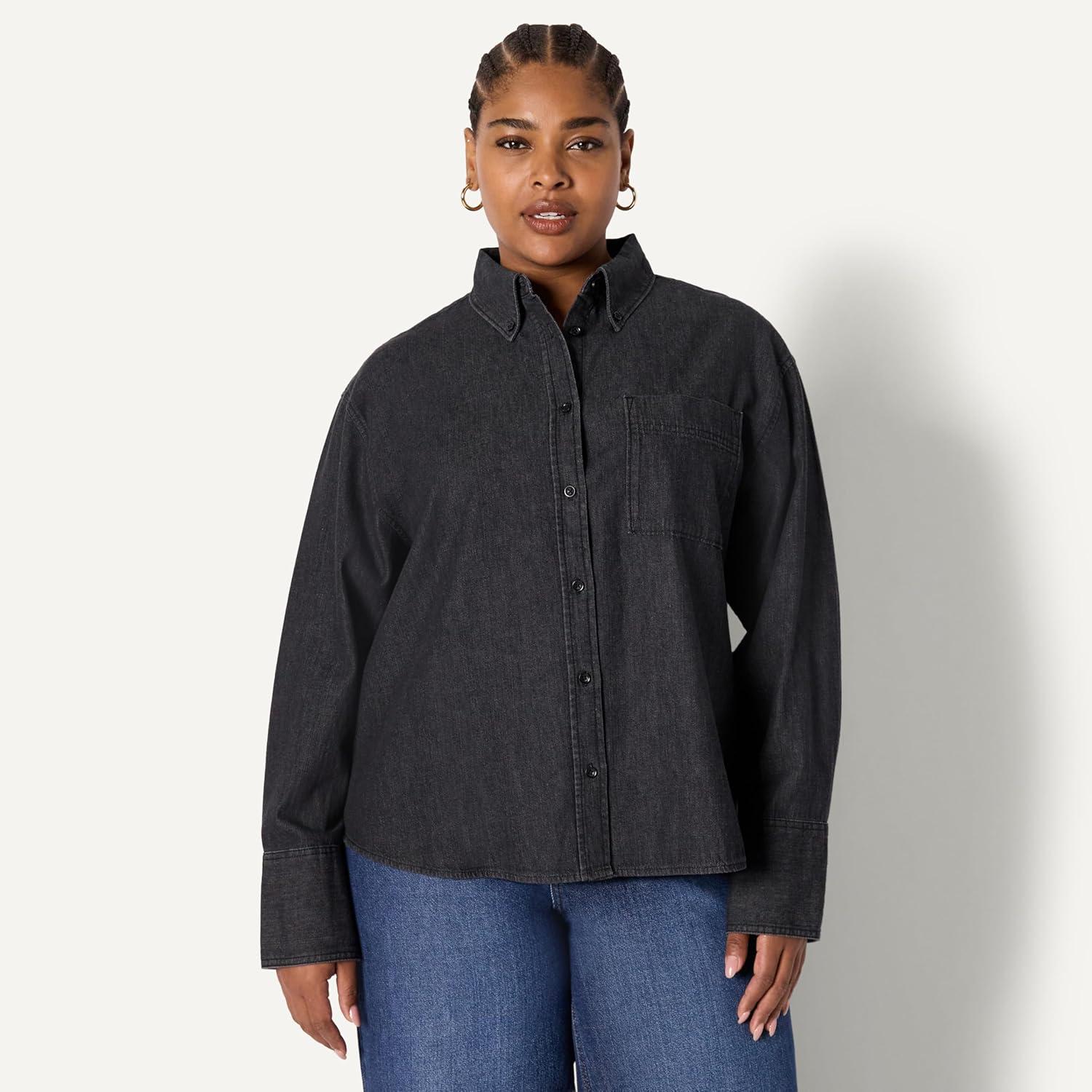 Amazon Essentials Women’s Oversized-Fit Denim Button-Down Shirt(Black)