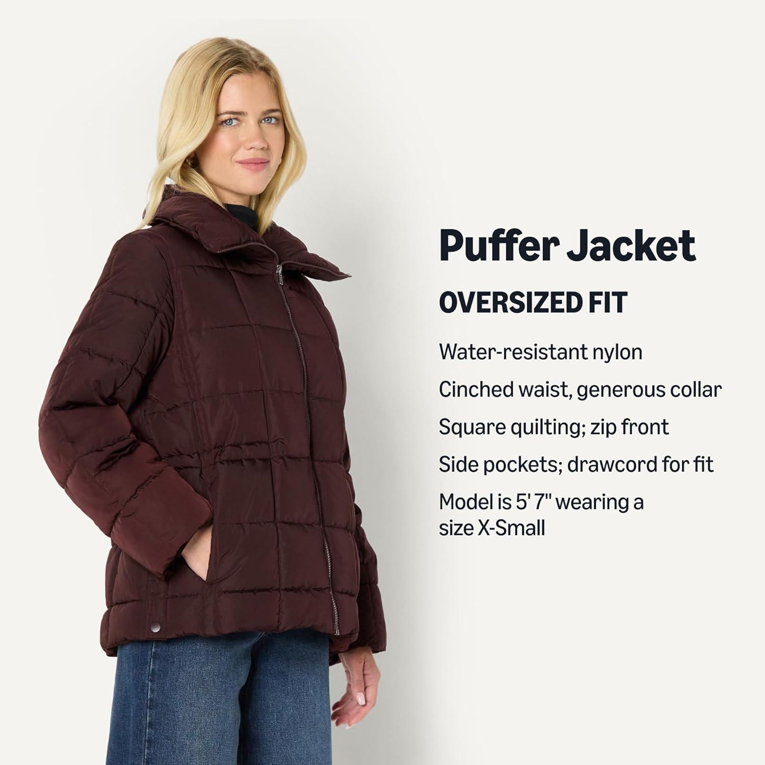 Amazon Essentials Womens Oversized-Fit Square Quilted Puffer Jacket with Adjustable Waist(Dark Maroon)