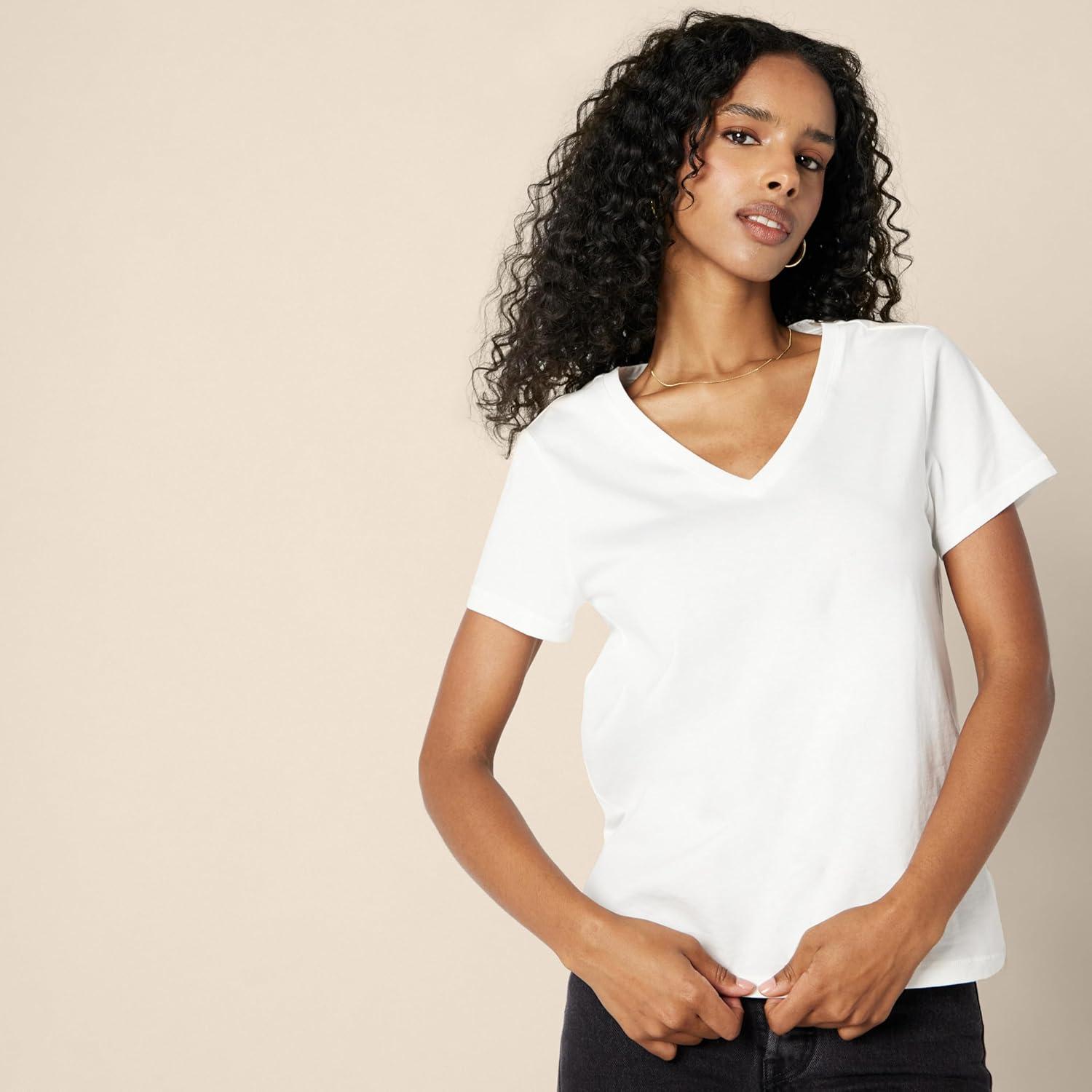 Amazon Essentials Womens Regular Fit 100% Cotton V-Neck Short Sleeve T-Shirt(Black/White)