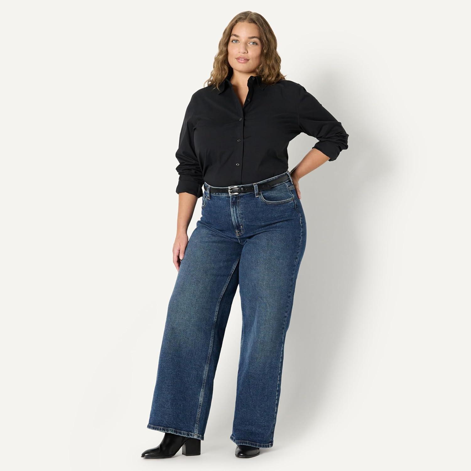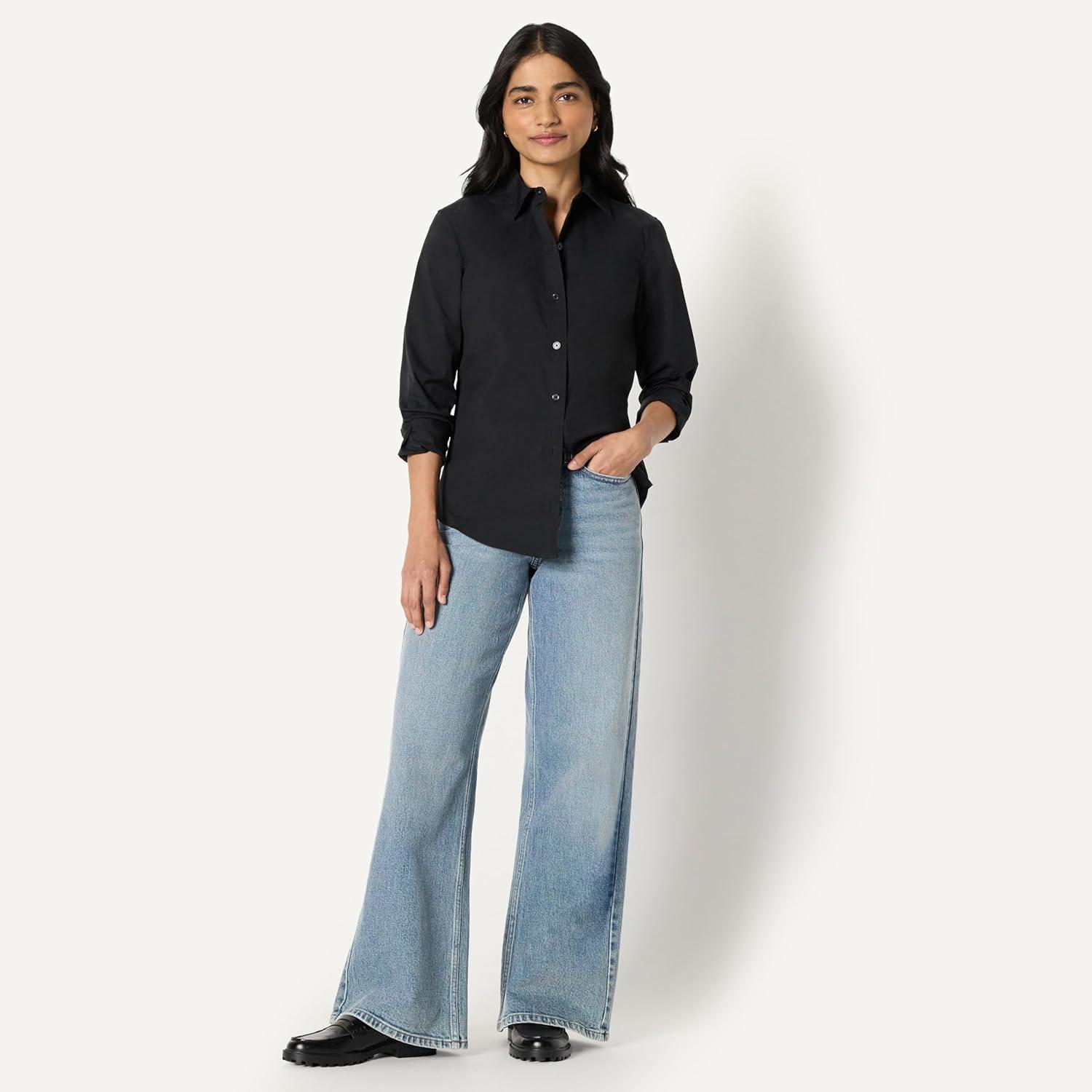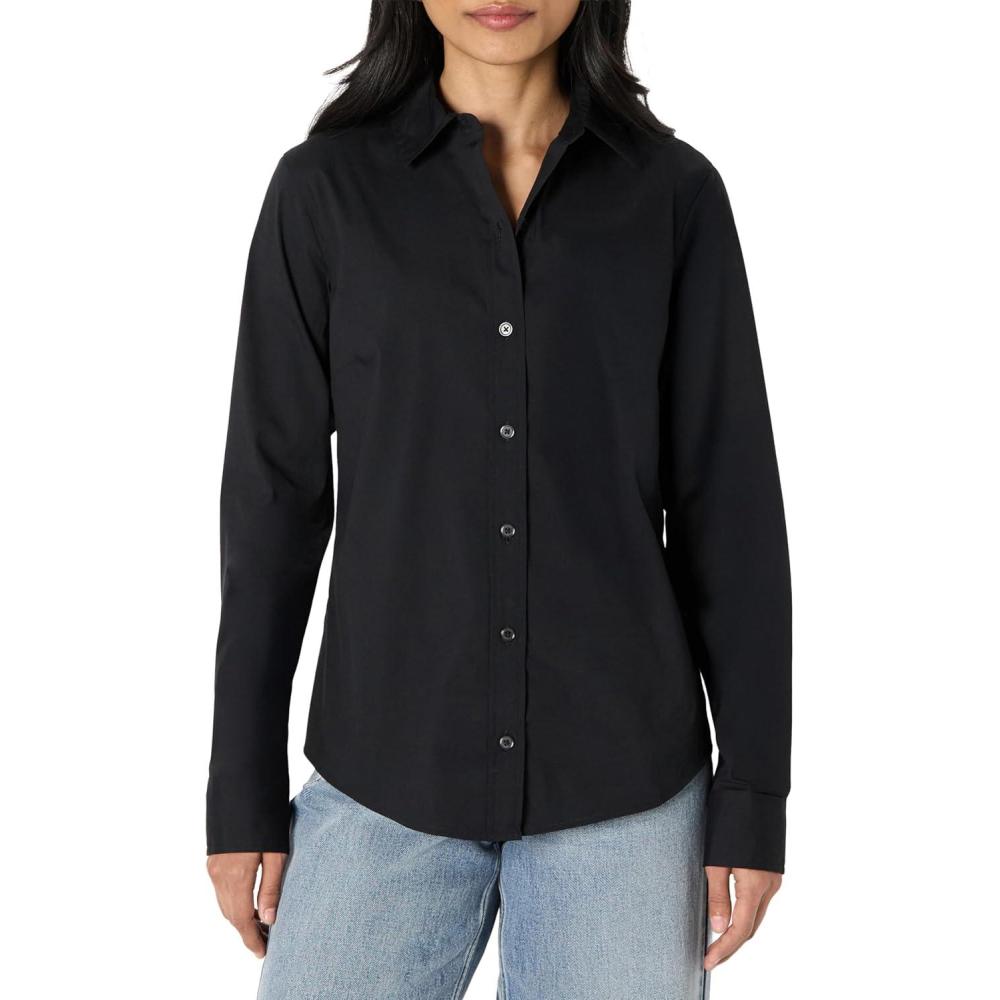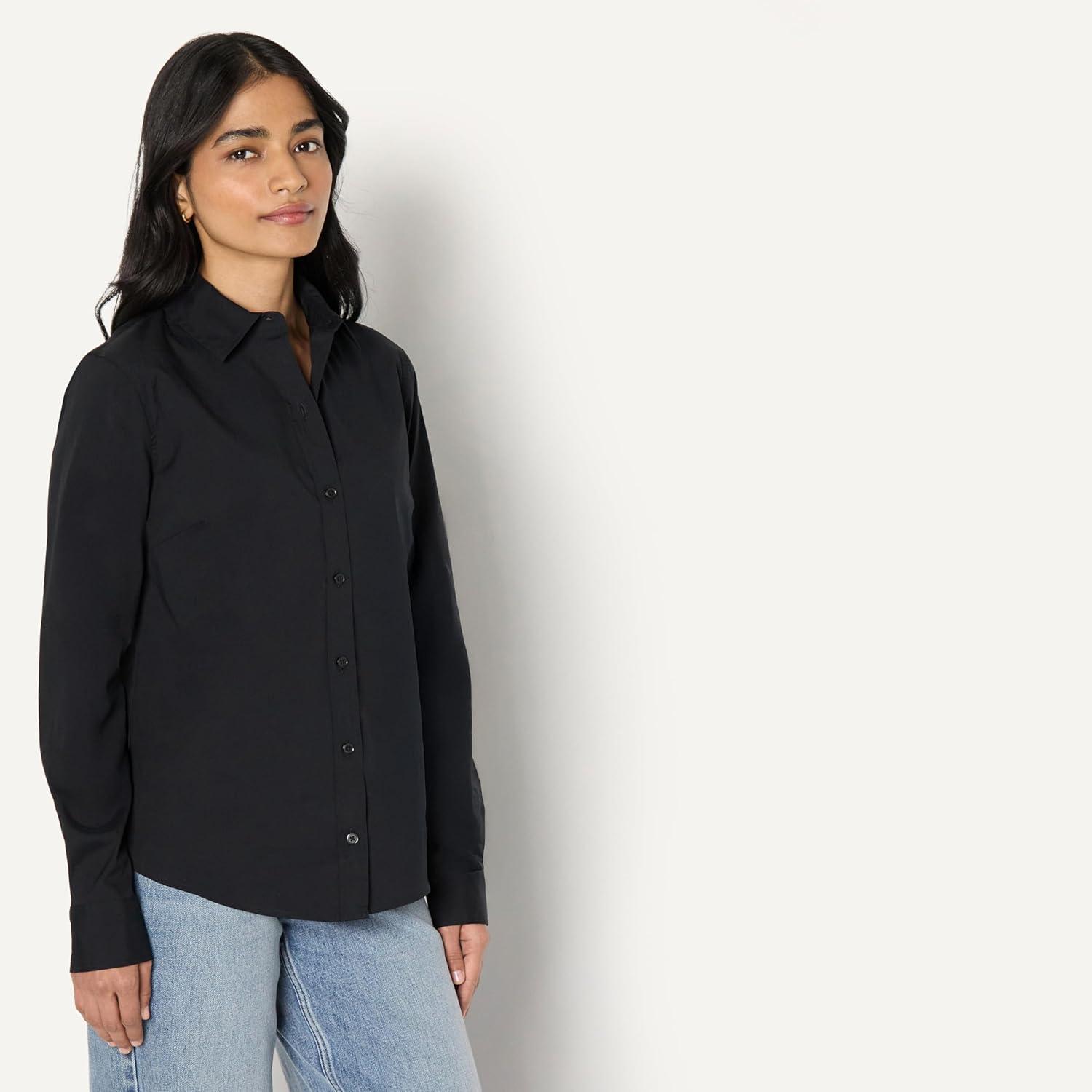 Amazon Essentials Women’s Regular-Fit Stretch Poplin Button-Up Dress Shirt(Black)