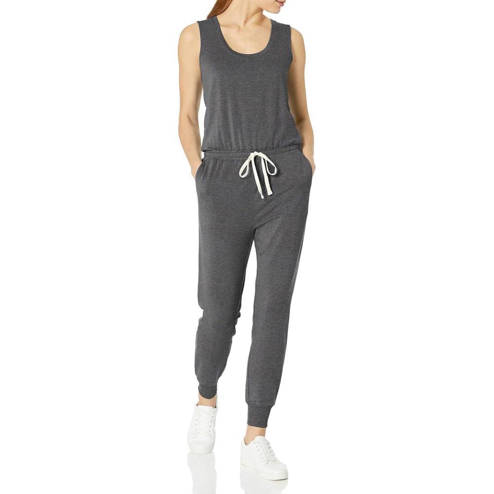 An Amazon Brand – Relax and lounge in this all-in-one jumpsuit featuring a sleeveless, scooped neckline top and a full length jogger with a drawcord waist